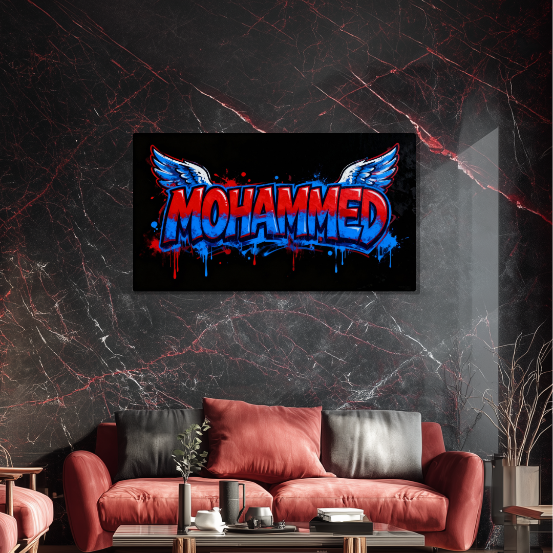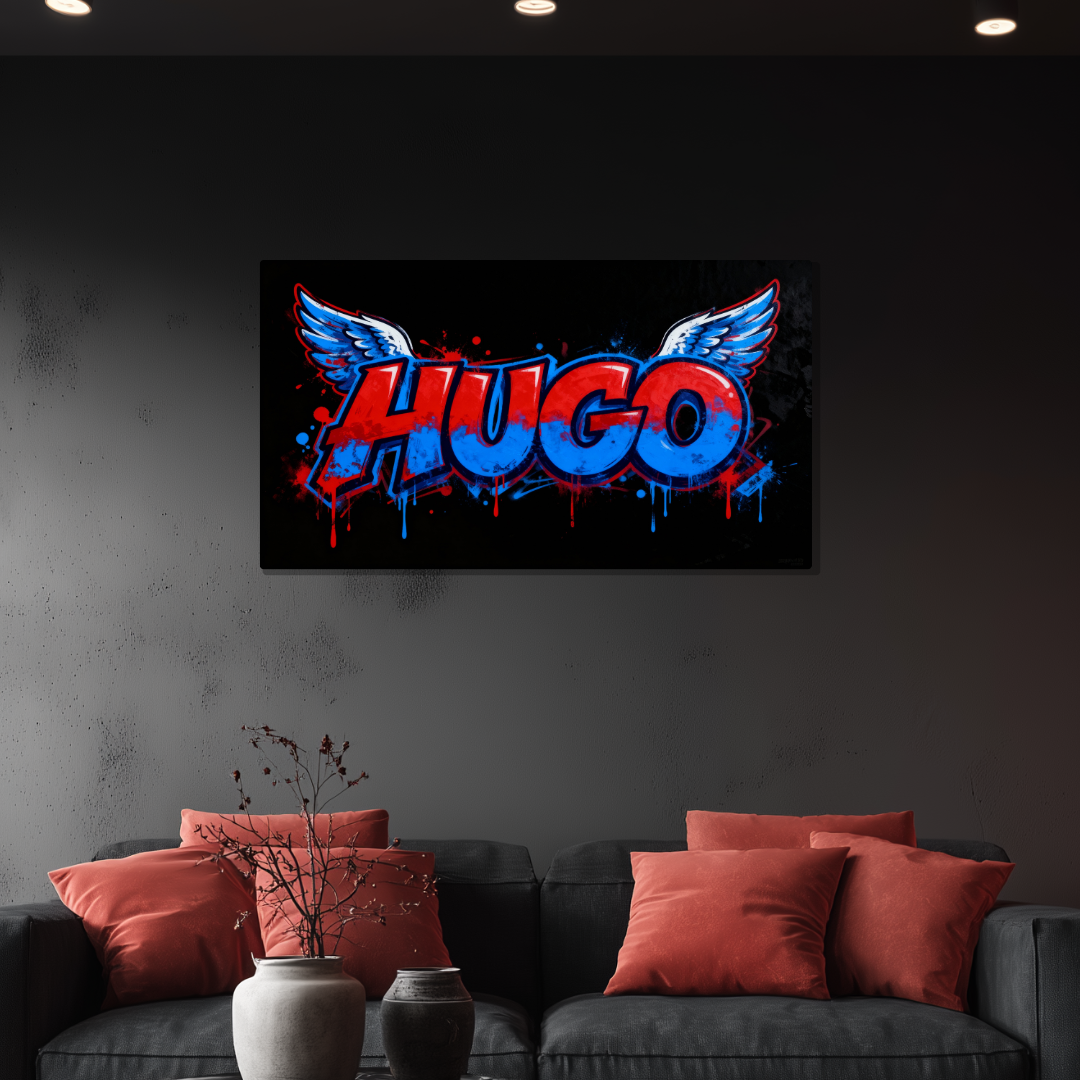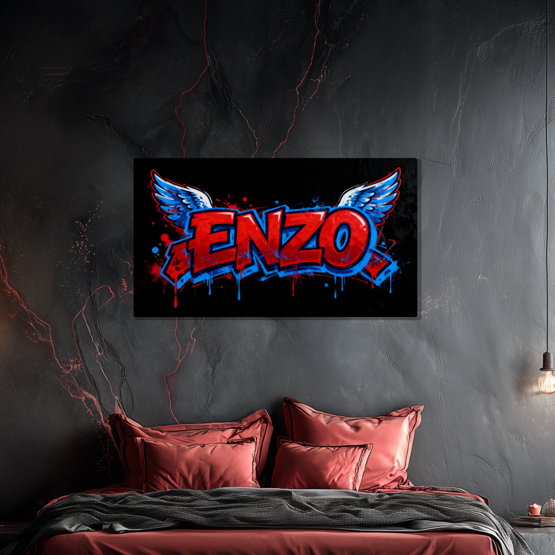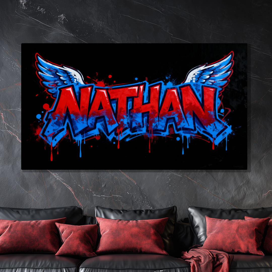 Tableau Prénom Personnalisé Graffiti Ailes d'Anges Bleu et Rouge